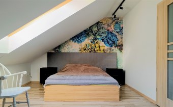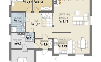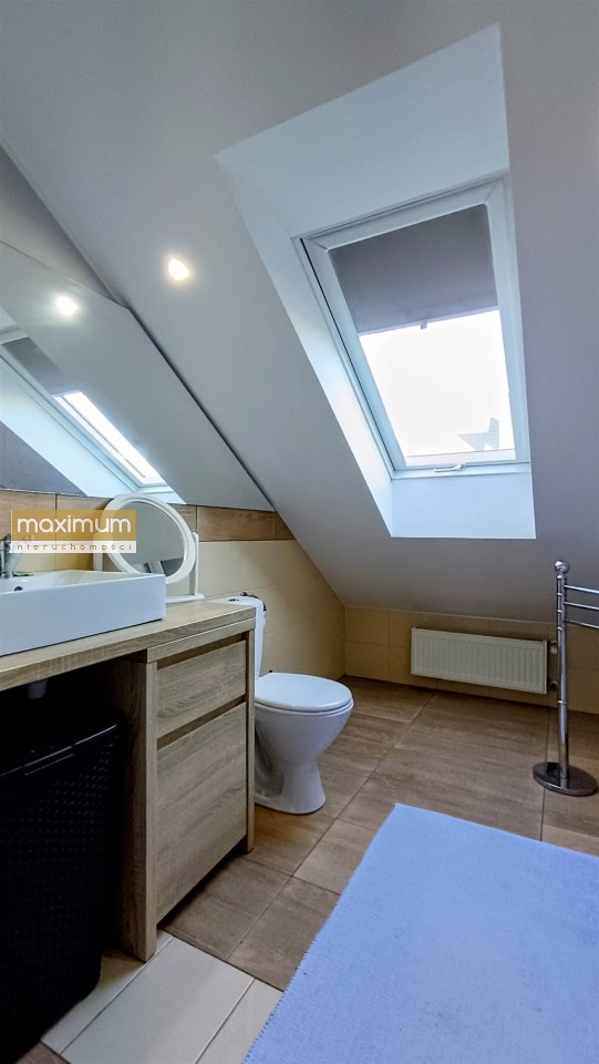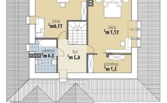 Na parterze domu znajduje się przestronna część dzienna, sypialnia i łazienka oraz część gospodarcza z garażem. Na poddaszu zlokalizowano dodatkowo 2 sypialnie w tym jedną z garderobą, łazienkę i pralnię.