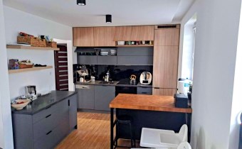 - kuchnia częściowo otwarta na salon z meblami w zabudowie na wymiar, sprzęty AGD