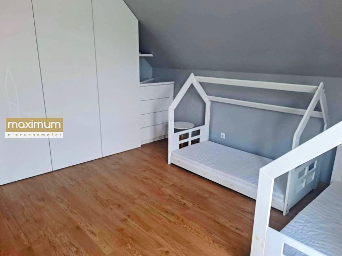 Na parterze domu znajdują się duży salon z wyjściem na taras, sypialnia (gabinet), kuchnia, pomieszczenie gospodarcze (spiżarnia), łazienka z wc, kotłownia. Na poddaszu: 3 sypialnie w tym 1 sypialnia z garderobą, pokój dzienny, łazienka, pralnia.
